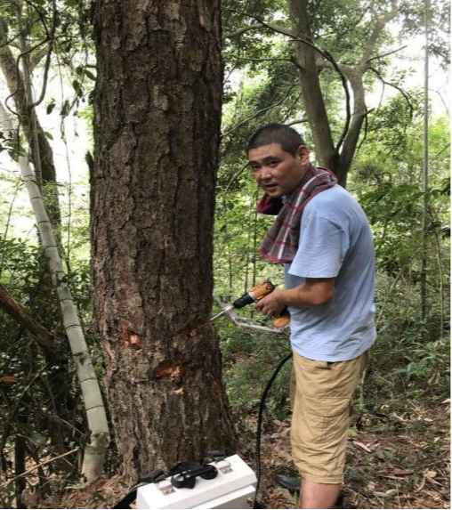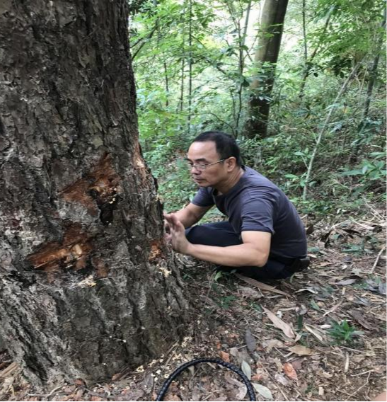 2022年9月8號(hào),汪洋帶上綠友電動(dòng)樹(shù)干打孔注藥機(jī)、木塞、藥品以及相應(yīng)工具。早上五點(diǎn)鐘從廣州出發(fā),舟車(chē)勞頓數(shù)百公里,踏上拯救坪坑參天古樹(shù)的旅程。趕到潮州坪坑村,村委部文主任領(lǐng)路去村后的山上查看古松樹(shù)。在看過(guò)所有的古樹(shù)以后,根據(jù)松樹(shù)的枯葉癥狀,樹(shù)木呈現(xiàn)出來(lái)的病癥,最后診斷確認(rèn)是松材線蟲(chóng)危害所致。汪洋將診斷結(jié)果以及解決方案告知文主任,并通過(guò)電話向省林業(yè)部領(lǐng)導(dǎo)作匯報(bào),得到批復(fù)后立即展開(kāi)作業(yè)。