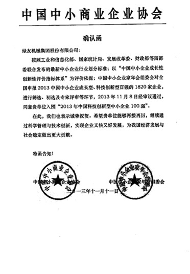 綠友榮獲“2013年中國科技創新型中小企業100強” 確認函: