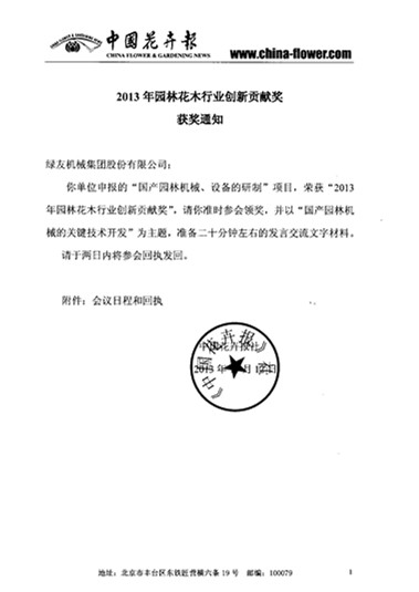 綠友集團申報的“國產園林機械、設備的研制”項目獲得了“2013年園林花木行業創新貢獻獎”。該獎將在11月23日江西南昌舉辦的“2013中國園林花木行業創新大會暨聚焦江西千億花木產業發展高峰論壇”上進行頒發,屆時將有以“國產園林機械的關鍵技術開發”為主題的發言。