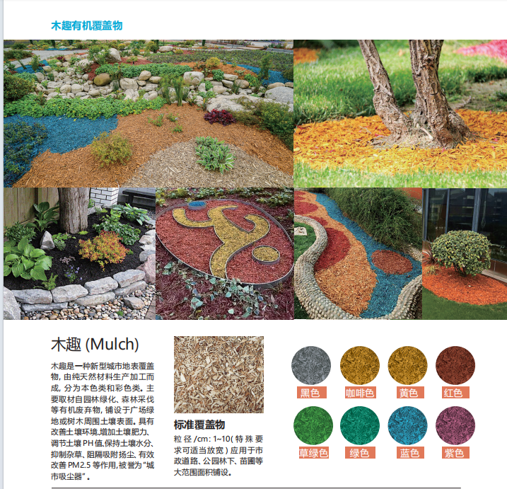 有機覆蓋物:是利用各種有機生物體材料,通過各種生產(chǎn)工藝,加工處理后鋪設(shè)于園藝植物或樹木周圍的土壤表面,起保持土壤水 分、吸附揚塵、調(diào)節(jié)土壤溫度、增加土壤肥力、抑制雜草、促進植栽生長、減少土壤侵蝕和緊實度以及裝飾美觀等等作用。(如下圖)